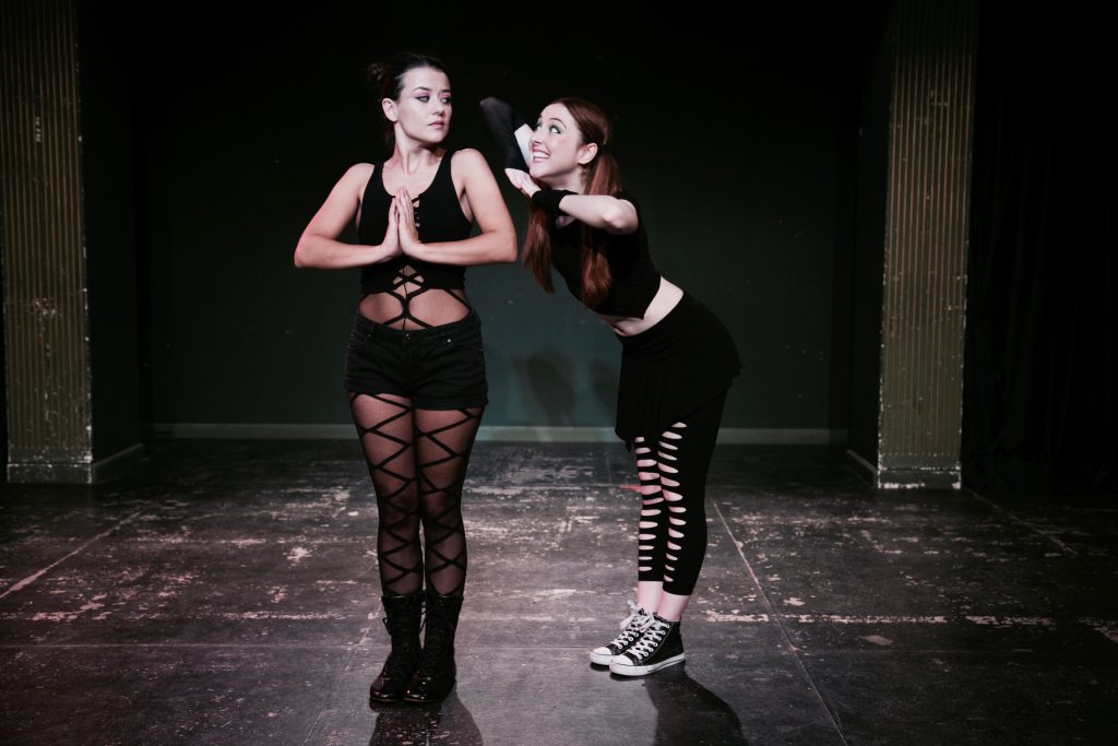 Ángela Peirat (izquierda) es la mujer recientemente embarazada y Ana Azorín su feto feminista y de Provida («Feta, maja, llámame Feta…»): un gozoso esperpento con directas alusiones a la actualidad.