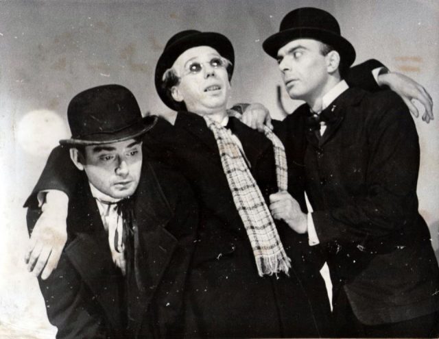 Tal vez la primera representación en lengua castellana de «Esperando a Godot». En Buenos Aires, 1956, con traducción del crítico y dramaturgo Pablo Palant. En la foto, de izquierda a derecha: Roberto Villanueva, Jorge Petragia —también director, luego gran especialista en la obra de Beckett— y Leal Rey.