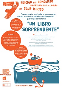 Por su parte, la red de librerías del Club Kirico anunció recientemente la 7ª edición de Reporteros de la Lectura con el lema “Un libro sorprendente”. Se concederán tres premios por otros tantos tramos de edad: de 7 a9, 10 a 12 y 13 a 15 años que podrán concursar en modalidades como: escritura, dibujo, cómic y fotografía. El plazo finaliza el 30 de abril y los premios consistirán en cheques que se podrán canjear por libros en cualquiera de las librerías del club.