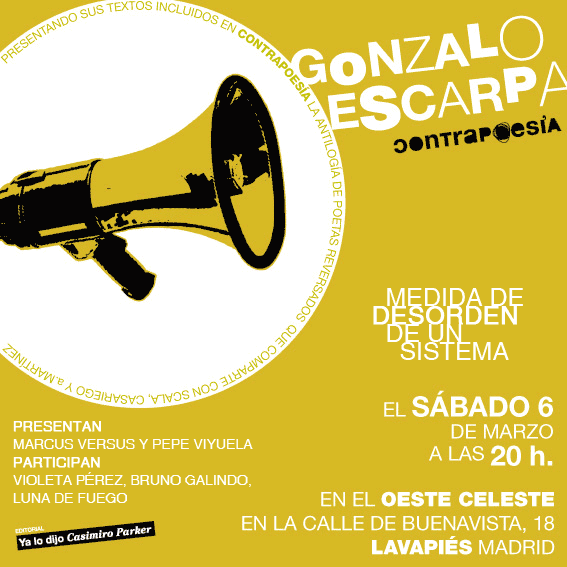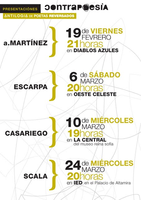 Presentación de la antología CONTRAPOESÍA, publicada por la editorial Ya lo dijo Casimiro Parker (Madrid, 2010). Cada uno de los cuatro poetas incluidos lleva a cabo una presentación personal.
