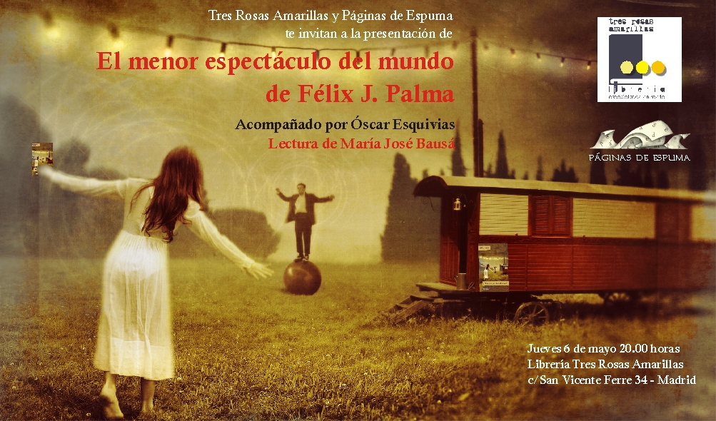 Este jueves, 6 de mayo, se presenta el libro El menor espectáculo del mundo, de Félix J. Palma, en la Librería Tres Rosas Amarillas (c/ San Vicente Ferrer, 34), en el barrio de Malasaña. El acto será a las ocho de la tarde y correrá a cargo del propio autor, que estará acompañado de Óscar Esquivias y una lectura de María José Bausá.