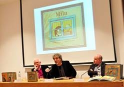 El pasado miércoles se presentó Milu en la Fundación Luis Seoane de A Coruña, a la que acudieron al autor de la obra Manuel Rivas, la concejal de Servicios Sociales de A Coruña, Silvia Longueira, el vicepresidente de Meniños, Xosé Manuel Villanueva, el director de Kalandraka, Xosé Ballesteros, y numerosos profesionales vinculados a Meniños, libreros y bibliotecarios.