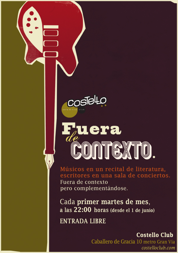 Escritores en una sala de conciertos y músicos en un recital de literatura. Poesías, relatos y canciones, es decir, un poco de todo. El primer martes de cada mes, la Sala Costello albergará el Festival Fuera de Contexto con Laura López y Guillermo Ortiz como anfitriones y distintos invitados que cambiarán según el mes. Una auténtica gozada en dosis cortas, una hora aproximadamente, y completamente gratis.