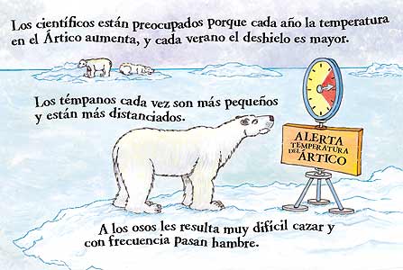 Oso polar, ¿sabes por qué se deshiela tu mundo? es de un libro bellamente ilustrado con amplia información escrita que permite adaptarlo a niños de muy diversas edades, desde los que no saben leer (y que comprenderán la información presentada de manera visual, ya que los dibujos hablan por sí mismos) a los que ya tienen capacidad para hacerlo y, por tanto, podrán asimilar y comprender mejor los datos aportados.