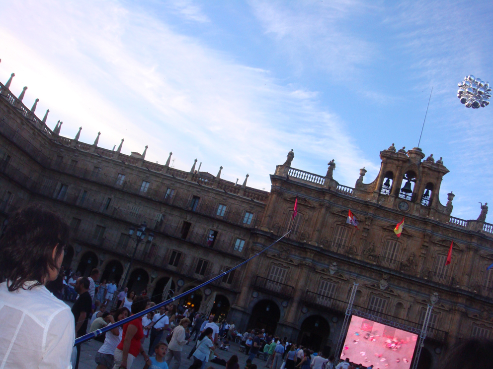 Un acierto ha sido recurrir para la parte artística a la organización profesional de la galería Adora Calvo, por la cual pudimos disfrutar de la Performance “Ventana Cenital” de Olga Diego, en la Plaza Mayor de la ciudad. Con una caña de pescar dirigió un conjunto de globos que portaban una video-cámara, mostrando una visión cenital y bastante aleatoria, en una gran pantalla, interactuando con el público y desplegando un artefacto de aire dieciochesco, donde los elementos dispares se unían de forma sinérgica para crear una nueva máquina, para una nueva función.