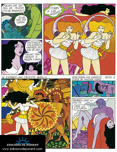 Hay otras imágenes como la de las ninfas en Las manzanas del jardín de las Hespérides, que me recuerdan dibujos modernistas; en Los caballos de Diómede me llama la atención el colorido de los caballos y la limpieza de sus rasgos, también el paso armonioso de los equinos que conducen a Hércules y Yolao en La hidra de Lerna y el de las amazonas en el cinturón de Hipólita por citar algunos.