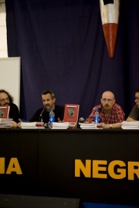 Brian Azzarello y Eduardo Risso, guionista y dibujante del comic 100 Balas, están sentados tras 200 ejemplares de la “Guía de lectura de 100 Balas”, que será entregada a todos los asistentes tras la presentación así como en las exposiciones de 50 en 50 ejemplares por día, y que ha sido creada por Norman Fernández y Pepe Gálvez, también presentes en la mesa.
