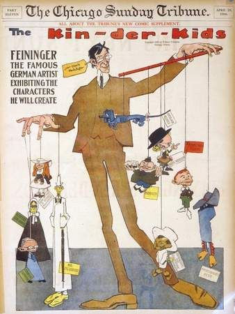 Antes de todo eso, durante sus primeros años en Europa, Feininger había sido autor de cómics. Trabajó para publicaciones alemanas como Ulk o Das Narrenschiff. Con su ingenio y su estilo caricaturesco, adquirió cierto prestigio. Y fue esa la principal razón que condujo al Chicago Daily Tribune a incluirlo en su plantilla, con la intención de revitalizar su suplemento dominical entre su amplia base de lectores de origen alemán. Feininger construyó su peculiar universo de ficción alrededor de un mundo de fantasía protagonizado por estrambóticos personajes, robots-sirvientes, vehículos animados, peces parlanchines y omnipresentes paisajes angulosos. Su serie comenzó el 19 de abril de 1906 y se denominó The Kin-der-Kids; en ella, Feininger demostró un talento inusitado para la composición de página y para la narración vertiginosa de aventuras con cierto aire slapstick. The Kin-der-Kids no llegó al año de duración. Fue sucedida por Wee Willie Winkie’s World (el 19 de agosto): las aventuras entre oníricas y alucinadas de un niño imbuido por ataques de imaginación sinestésica, que, cual infante Don Quijote, ve monstruos donde sólo hay rocas y mira a las casas y objetos como el que contempla vivísimos seres mitológicos. Feininger no dibujó más viñetas a partir de ese momento.