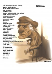 Hace unos años, cuando en el Bukowski club Inés y yo empezábamos a jugar en serio a que la literatura se bebiera unas copas y que quitara el refajo, Gonga era el crítico más feroz y el más feliz cuando descubría un talento entre el humo del local. Por ese tiempo, Igor Heras le hizo de memoria esta exacta caricatura y yo el poema inexacto que la acompaña.