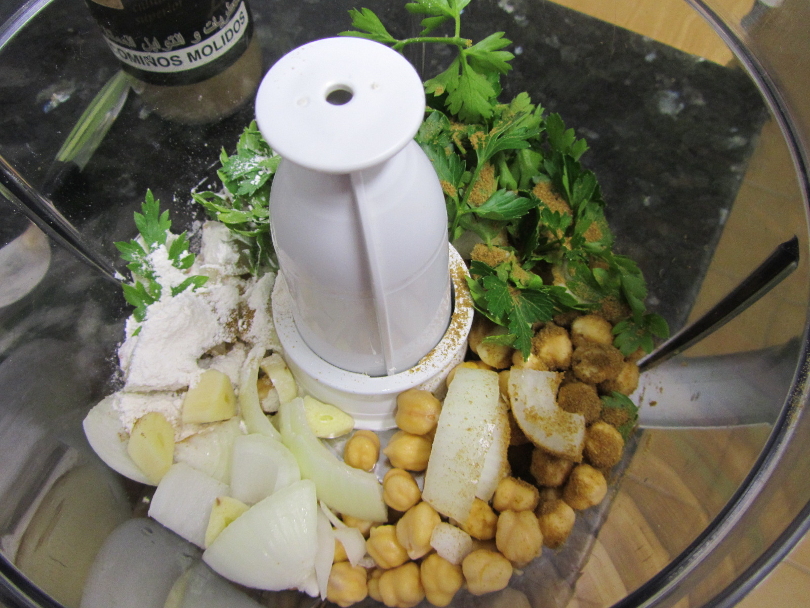 - Poner todos los ingredientes menos la levadura en un robot y triturar, si es posible con movimiento intermitente, hasta obtener una arenilla gruesa. No debe quedar una pasta porque entonces los falafel resultarían secos.