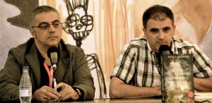 Estos gritos, en la Carpa A Quemarropa. A su lado, Rodolfo Martínez como presentador de “2022, la guerra del gallo” y su autor Juan Guinot. Martínez asegura haber encontrado en “2022” una epopeya contada desde el realismo a pesar del maquillaje fantástico con que Guinot la disfraza.