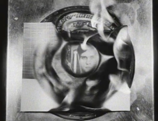 Sin embargo, la pieza que destaca en esta parte inicial de la exhibición es la filmación ‘(nostalgia)’ (1971), formada por un conjunto de fotografías que la voz en over del autor analiza mientras van quemándose ante la cámara. Dado que dichas fotos corresponden a obras realizadas a lo largo de toda su carrera, y puesto que los comentarios de Frampton no se limitan a hacer una exégesis de las piezas a punto de incinerarse, sino que también dan pinceladas sobre su estado anímico y sus circunstancias personales en el momento de realizarlas –junto a otro tipo de disquisiciones relativas a su presente, al momento mismo de la filmación–, el vídeo se constituye en una potente reflexión sobre el paso del tiempo. A ello contribuye de forma decidida la total asincronía que se produce entre las imágenes mostradas y la descripción de cada una de ellas, además de la lenta e hipnótica reducción de cada instantánea –de cada instante– a un amasijo de cenizas y papel carbonizado. Pese a su desgarradora y existencialista temática, la película tiene un tono más melancólico que angustioso, atemperada por un sentido del humor que emana tanto de las palabras del autor como del chocante contraste entre las fotos mostradas y el discurso que las acompaña. Puede decirse, pues, que la cinta se asienta sobre la paradoja que hay entre la concatenación de las fotos fijas (still photographs en inglés) y el hecho de que nada en la vida permanezca “fijo”, “quieto” (still).