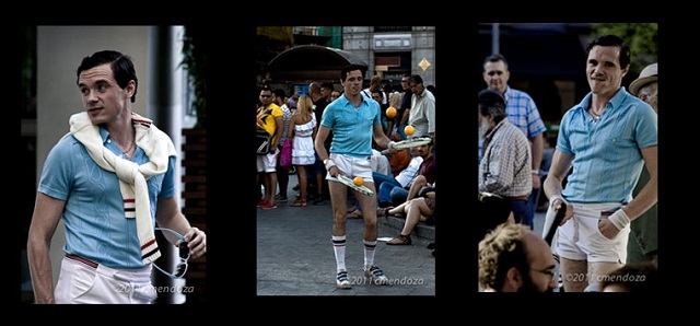 Y es que el acierto mayor está siempre presente: un desfile de barbaridades pijas en boca de un pijo tenista que llena el escenario con la plasticidad de un actor hecho en la expresión corporal, que canta estupendamente (también en una parodia de Raphael incomparable), que imita muy bien a una buena galería de personajes de la barbarie nacional —el rey, Urdangarín (y su jardinero Evaristo), José María Aznar, Zapatero…—(empieza con Fernán Gómez al que rinde homenaje ¡confundiéndole con “la gran Concha Velasco”!: una escena que me hizo reír tanto que casi me ahogo)—.