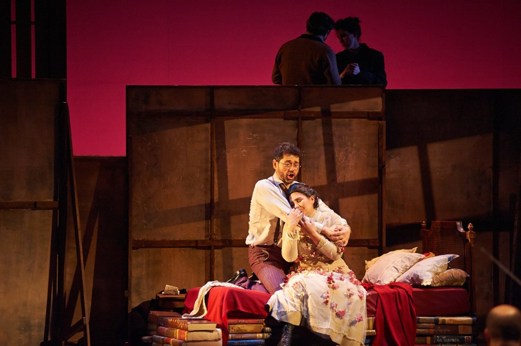 Rodolfo y Mimí ante la cercanía del último suspiro, y detrás Museta y Marcelo, los amantes aún cargados de ilusiones.
