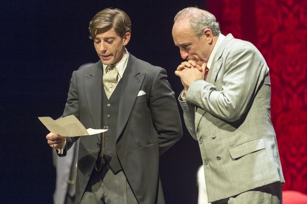 Ya digo, MM sabe mucho del juego de máscaras y de ir del anticlímax a la emoción más afinada. Una tarea especialmente difícil para los intérpretes, por eso esta versión de El discurso del rey empieza con un telón que se levanta lentamente para que veamos a tres actores vestidos de época sentados frente al público, y a un cuarto personaje ocupado en vestir a Adrián Lastra que está de espaldas a los espectadores, completamente desnudo.