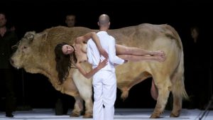 La disputa se traslada a los decorados, al atrezo y a los colores. El primer acto se desarrolla todo él a ambos lados de un estor transparente en la boca del escenario, que simula la calima cegadora del desierto. Priman las formas suaves, blandas y azuladas. El segundo, en cambio, es el reino de los oscuro y coincide con el despliegue de las danzas orgiásticas de la partitura de Schöenberg, cuando el pueblo israelita se deja arrastrar hacia la adoración de los viejos y nuevos tótems: el Vellocino de Oro, convertido en toro descomunal, en contraste con la fragilidad de un cuerpo desnudo de mujer. Una pintura negra, densa como alquitrán, se vierte una y otra vez sobre los blancos vestidos, sobre las flores y hasta sobre la grupa del gran toro. Es el símbolo de lo más atávico y ritual de la naturaleza humana; sangre e inmolación.