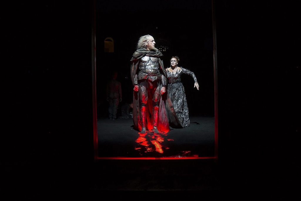 La Orestea dirigida por Luca de Fusco presenta una estética entre avernal y futurista; para amplificar los efectos, se sirve de vídeos que trabajan la gran escala y el desdoblamiento del personaje en pantalla. El vestuario diseñado por Zaira de Vincentiis tiende a los tonos negros y plateados, especialmente en la primera parte, caracterizada por un espacio de texturas lunares y una iluminación tenebrista que incide en la inexorabilidad de la maldición y del fato. La nocturnidad de Agamennone —surcada por una luz roja, que traza un camino de sangre hacia el palacio y reverbera en los personajes sobre los que pesa el destino de un crimen inminente— evoluciona hacia la luz de Eumenidi, con una Atenea resplandeciente que dictamina el fin de la sociedad primitiva e inaugura la época de Pericles, donde los ciudadanos integran tribunales y enjuician los hechos guiados por la razón.