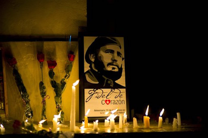Una imagen de Fidel Castro rodeada de velas. Foto: AP.
