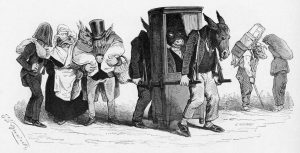 Los perros de los grabados de Grandville no son en modo alguno caninos; tienen cara de perro, pero lo que sufren en la perrera es su encarcelamiento como hombres. El oso es un buen padre muestra a un oso empujando sin ganas un cochecito de niño, como podría hacerlo cualquier jefe de familia humano. El primer volumen de Grandville termina con las siguientes palabras: “Buenas noches, pues, querido lector. Vete a casa y cierra tu jaula; que duermas bien y tengas felices sueños. Hasta mañana”. Los animales y el populacho han pasado a ser sinónimos, lo que equivale a decir que los animales están desapareciendo.