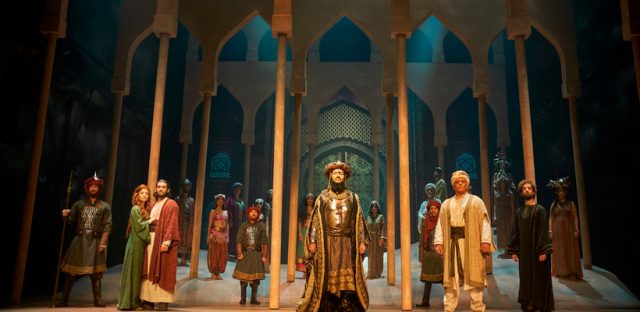 Una de las escenas con muchos personajes donde destaca la brillantez del vestuario y la escenografía. En el centro, Alain Dimas como el Sha, que tiene a su cargo algunas de las arias de mayor impacto.