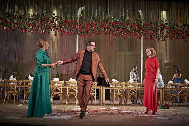 Chirría la adaptación a partir de la falta de contexto histórico, apuntalados los recursos escénicos con un incomprensible espíritu narrativo, desde el comienzo la protagonista dirigiéndose al público, rematando con una bajada al patio de butacas, como si todos fuéramos sus invitados a la fiesta que está organizando para su marido, en ausencia de este. El patio de butacas lleno, el escenario enorme con muy poca gente. Todo tiene una incomprensible falta de interés porque como versión libre tampoco funciona. El aparente objetivo de mostrar a una clase social ociosa (aquí clase media) más o menos frustrada, pendiente de un feliz pasado que ya no volverá frente a dos jóvenes dispuestas a amarse alegremente… se expone a contrapelo con demasiados lugares comunes (irrupción roquera con dos temas cantados; el manido uso de móviles; insistentes frases hechas del tipo «amo a la vida»…) y sobre todo personalidades muy superficiales, sin fuerza, incapaces de convertirse en verdaderos personajes teatrales, de los que erizan la piel u obligan a sentarse en el borde de la butaca.