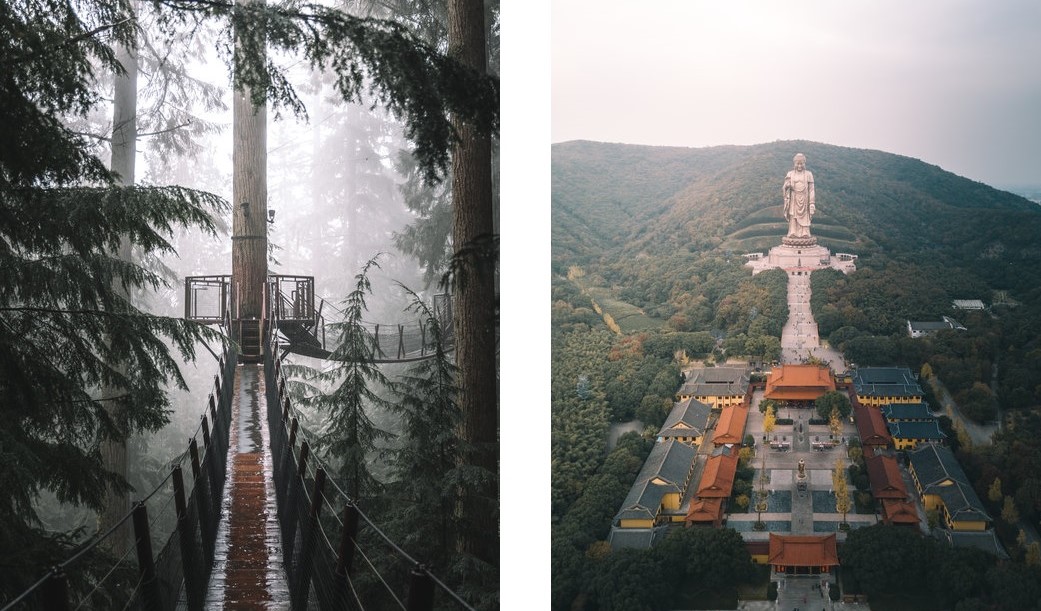 Capilano suspension bridge (izquierda) y Grand Buddha at Lingshan (derecha). © Tristan Zhou