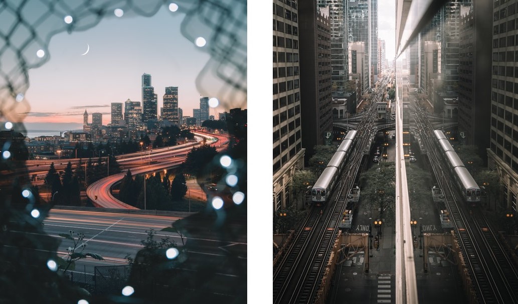 Seattle cityscape (izquierda) y Chicago reflection (derecha). © Tristan Zhou.