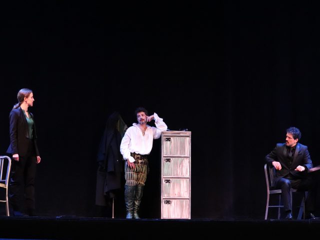 Ana Azorín, una abogada muy resolutiva; sentado, Jorge Mayor, Otelo, su cliente, y de pie, vigilando como un fantasma que se resiste a morir, David DeGea, Yago.