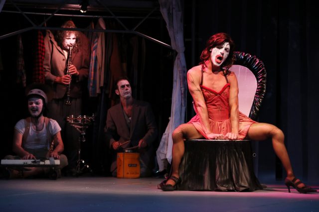 Payasos músicos y uno de ellos transformista, parodia sensacional de mujer fatal, tirando a fatalmente payasa mientras con su propia voz canta un clásico del tango arrabalero argentino: Se dice de mí… «que soy chueca, que camino a lo malevo…»
