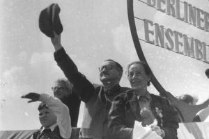 El Berliner abre fuego con Madre Coraje y sus hijos, por él mismo dirigida e interpretada por Helene Weigel (a la sazón, su segunda esposa, directora del Berliner tras su muerte). Entre ambos configuraron una forma de proyectar su gran ambición: la de un complejo escénico con una carga política que mostrara conflictos cuyas emociones no se desbordaran, como solía suceder en el teatro burgués, sino que permitiera que el público pensara antes de caer obnubilado por la emotividad o la belleza de lo interpretado. De allí que cuando se canta, se haga sin melodías envolventes, sino como un recurso de expresividad diferente, «la antiópera», así como esgrimiendo carteles que informan sobre determinadas escenas, y más allá aún la difícil peripecia de dar en el blanco de todo este tinglado ante la vorágine de una guerra histórica de religiones, entre católicos y protestantes, y en medio de su miseria «natural», el negocio que genera entre los grandes contendientes que la financian, y en el pequeño-miserable-angustioso negocio de una mujer con tres hijos de diferentes hombres, pícara, sensual, aguerrida, salvaje, espléndida y terrible Madre Coraje.