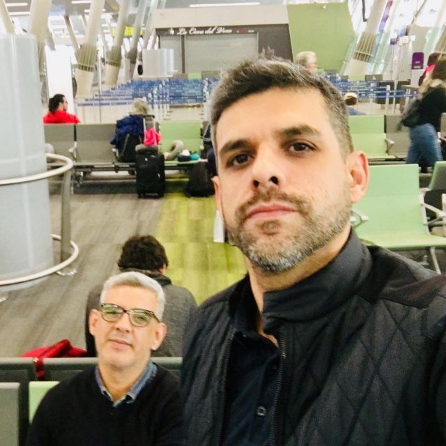 En un aeropuerto, lugar de residencia casi habitual. En primer lugar, David Quintana, autor y director; detrás, Fernando Quintana, intérprete y coautor de todas las andanzas de las compañías argentina, chilena, española.