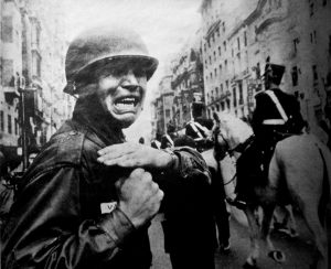 En la Avenida de Mayo, a pasos de la Casa Rosada, pasa el féretro del General Perón rodeado de granaderos a caballo. Un desfile imponente. En primer plano, un soldado hace su saludo militar y llora desconsoladamente ante la definitiva muerte de quien fue para su familia el gran padre de los más pobres del país. OLYMPUS DIGITAL CAMERA