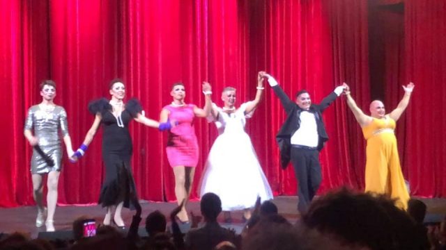 Glorioso saludo final con todo el público ovacionándoles de pie. De izquierda a derecha: Ricky Mata, Joan Salas, David Quintana, Fernando Quintana, Carlos Chacón, José Cobrana. Sin pelucas, ya sin personajes, ellos mismos, excelentes actores, hombres de teatro que forman un gran equipo creativo.