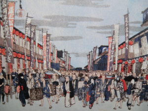 Teatros Kabuki en la calle Nichomachi. Utagawa Hiroshige, de la serie “Famosas vistas de la capital oriental”
