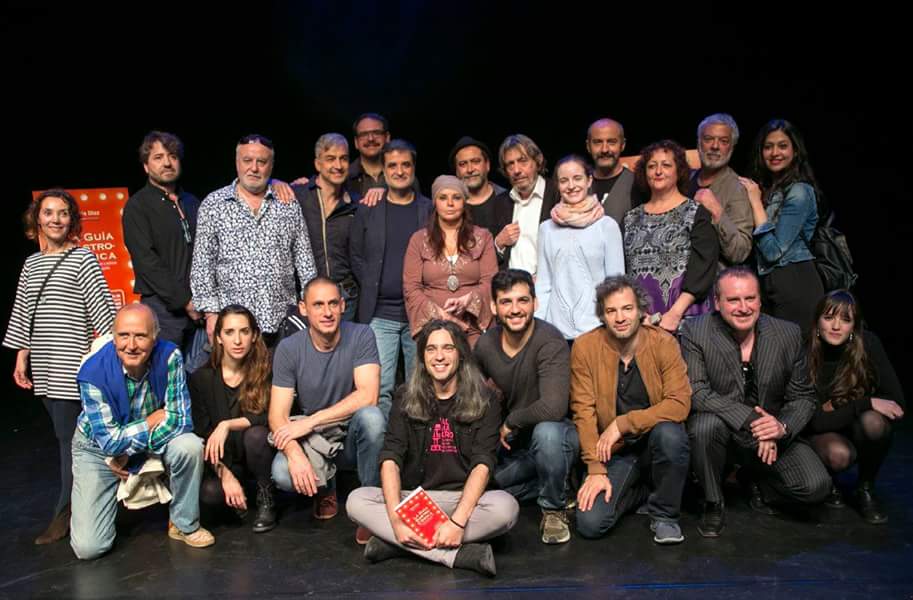 Muchos miembros de la gloriosa troupe «comecómicos» y en el centro —con sombrero gris— la autora del libro, María Díaz.