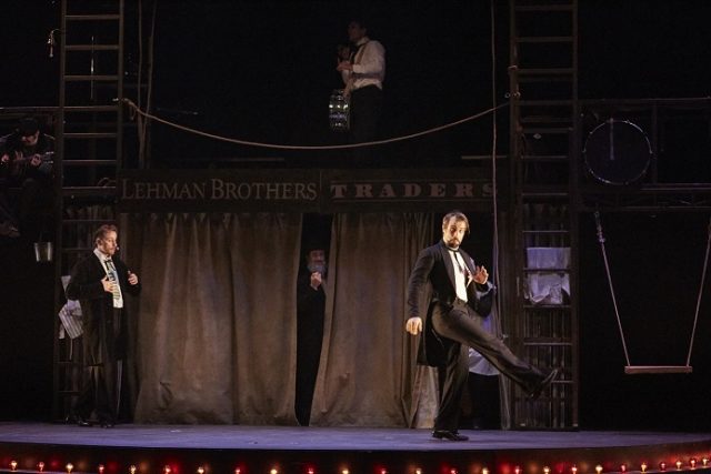 Sergio Peris-Mencheta fue responsable en los últimos años de un doblete apasionante: el intimismo como actor-director en homenaje a Mario Benedetti (A voz en cuello, 2017), y la espectacular Cocina de Arnold Wesker, 2016, síntesis magistral de la lucha por la vida en una sociedad capitalista. Ahora expande su talento con una obra de tres horas (reducción personal de un original de cinco). El resultado es fantástico en todos los sentidos: un goce ilimitado para los amantes del teatro total en el que se reunen la farsa, la comedia, el musical y todas las miradas sobre un mundo complejísimo construido entre 185o y 2008 por una familia ganadera procedente de Alemania, que llega al sur de Estados Unidos con la clásica inocencia del judío superviviente que une confianza moral y religiosa con excepcional habilidad para el comercio… hasta que el último heredero se convierte en un tiburón financiero y es devorado por su propia ambición en las redes de la tiranía del consumo, peste imparable nacida en el siglo XX: