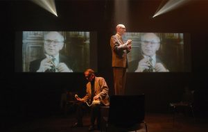 En pantallas, Milton Friedman y su «genial» parábola del lápiz como modelo del bienestar que genera la globalización capitalista. De pie, Juan Vinuesa enmascarado de Friedman, mima su discurso; sentado, Ramón Barea es el presidente Salvador Allende, condenado por la Administración USA tres años antes del golpe de estado, en cuanto ganó las elecciones.