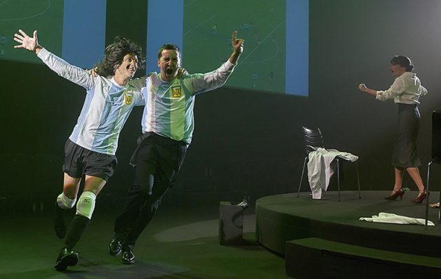 Ernesto Alterio (izq. con peluca) se quita el uniforme de Videla y se convierte en un jugador de éxito. Le acompaña Juan Vinuesa. Una de las escenas más divertidas y a la vez escalofriantes, ya que escenifica la inauguración del Mundial 78 y los goles de Argentina con un gran estadio festejando el fútbol y vitoreando al presidente, el dictador Videla, mientras en el país se secuestraba, asesinaba, torturaba…