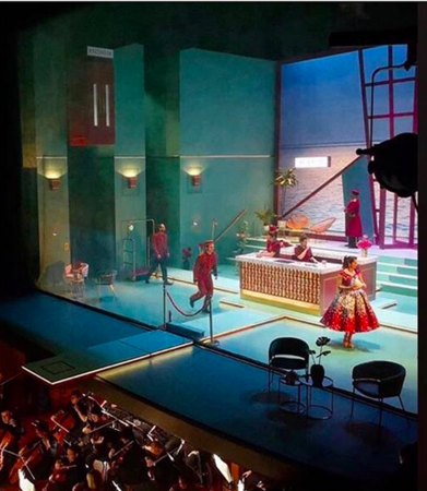 Me llamó José Martret para realizar mi primera ópera. No nos conocíamos personalmente, pero enseguida conectamos. Esa conexión en el primer momento es clave para empezar a trabajar con entusiasmo. Ya él tenía la idea de que la acción transcurriera en un hotel de los años 60, y de inmediato me puse a elaborar colores, textura, variedad de planos y contraplanos de un juego escénico espectacular con una partitura y unas voces que han cautivado a todo el mundo a lo largo de la historia. Uno de los momentos más emotivos fue cuando Martret ideó que el aria Una furtiva lágrimas fuera interpretada por Neporino sentado en el proscenio, con las piernas fuera del escenario, como cayendo en el patio de butacas, y entonces yo hice descender unas lámparas que creaban el ambiente poético de ese galán que jugaba al amor como si fuera un niño.