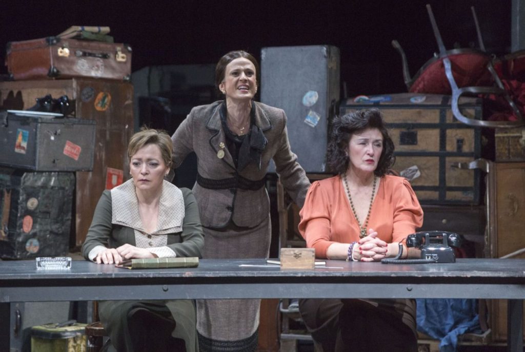 Sentadas, Resu Belmonte y María José Peris escuchan a Marta Chiner como Pilar Millán Astray, la amiga que, cargada de resentimiento, les viene a confirmar que han perdido todas las batallas y deberán ajustarse a las exigencias de la nueva situación política. Una de las escenas más logradas en cuanto aúna dimensión política, tensión social y profundo melodrama. (Foto: gentileza Antonio Castro).