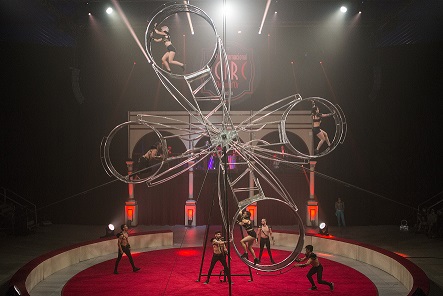 Bajo una puesta en pista de la mano de Dmitry Chernov, esta joven pareja de acróbatas rusos ofrecen un delicado repertorio de proezas en el mástil chino. Su talento les ha valido contrataciones en producciones de tanto prestigio como el circo navideño de Stuttgart.