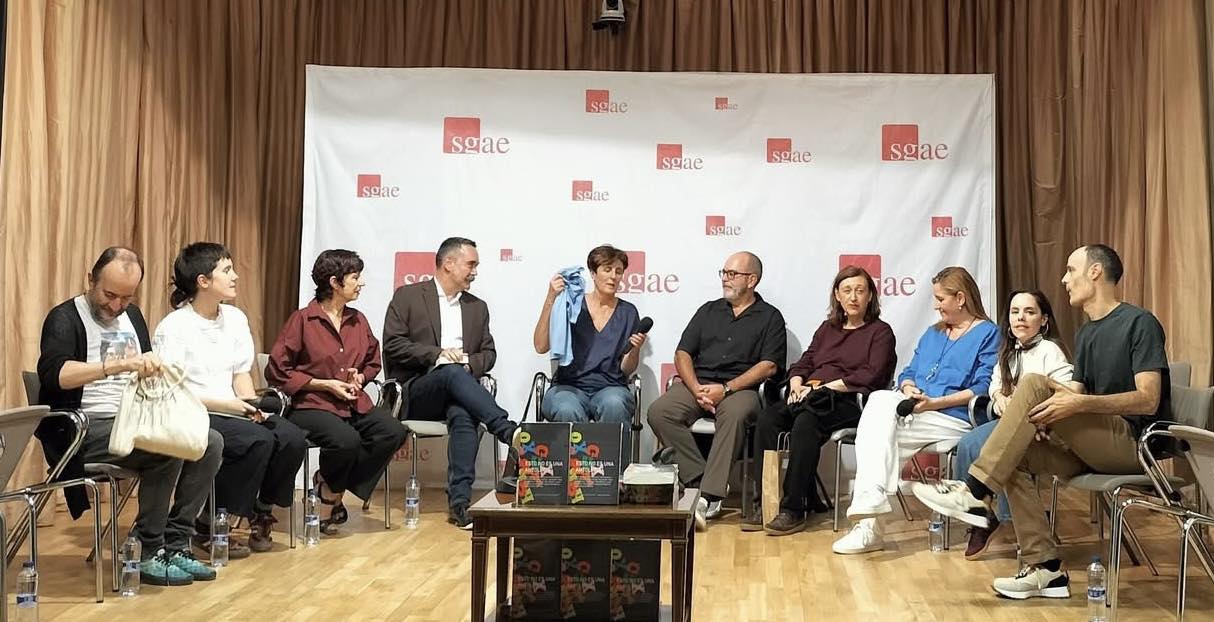Una emotiva presentación en la que no faltó el buen humor. Los autores y editores al pie del cañón: uno que lanza confites entre muchas preguntas y algunas respuestas. [De izquierda a derecha: Carlos Be, Ángela Monleón, Javier de Dios, Itziar Pascual, Ana Graciani, Celia Morán y Félix Estaire.]