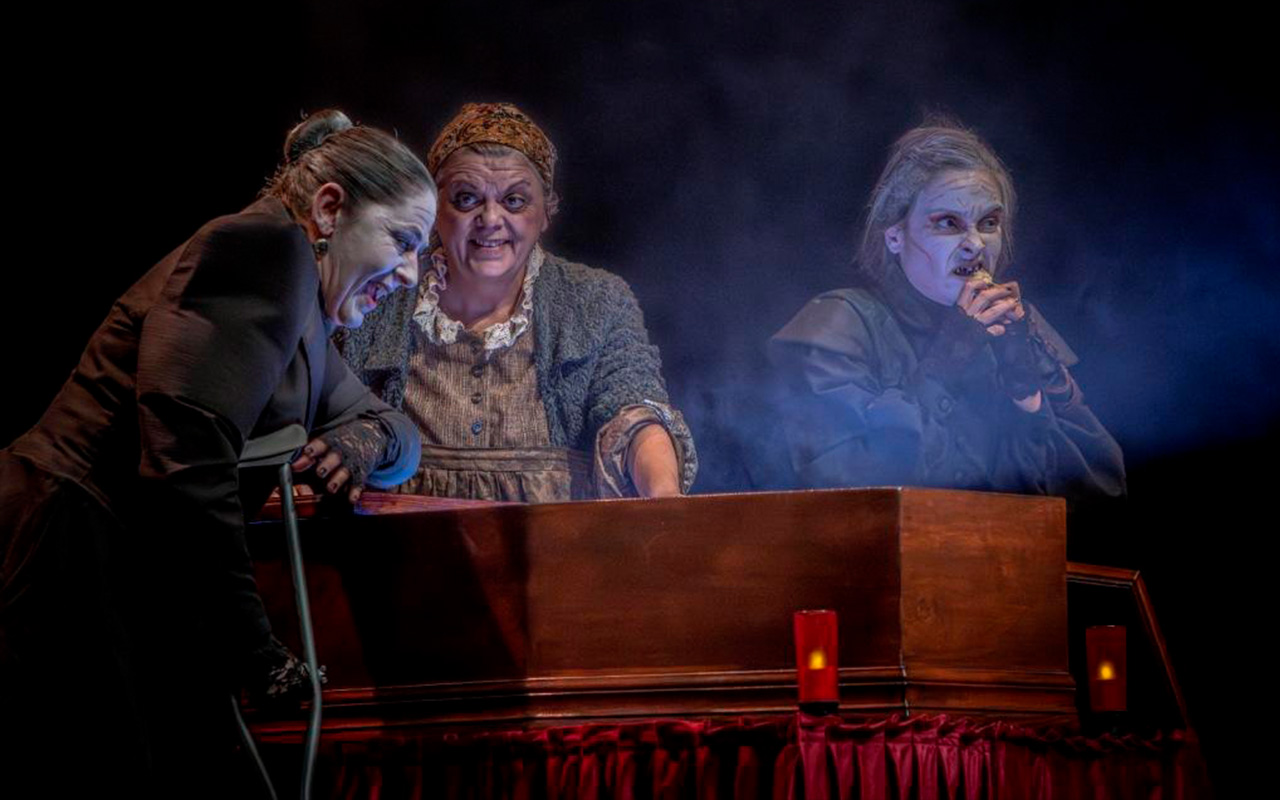 Los fúnebres y lorquianos atuendos (Azucena Rico) resaltan sobre la ambigüedad deconstruida de la estancia mortuoria. Los florales motivos y el omnipresente vano de la puerta, ofician de testigos de la situación social y la época en que transcurre la tragicomedia. Los distintos tipos de asientos definen la estructura piramidal entre las mujeres. Los diálogos son verdaderos hachazos verbales, algunos de estética goyesca y de querencia esperpéntica hasta situarlas en un mundo grotesco que podría ser pintado por El Bosco. No queda lejos el realismo mágico, ya que las arpías aguardan la transmutación del finado en el joven apuesto que fuera (vestido de guardiamarina) para darle su lugar en la tierra.