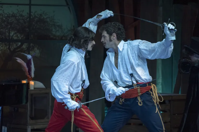 Una escena de la versión teatral en Madrid, Teatro Fernán Gómez, diciembre 2025-enero 2026, escrita por Javier Sahuquillo y dirigida por Emilio Gutiérrez Caba. (En la foto, Daniel Ortiz, Francisco Ortiz).