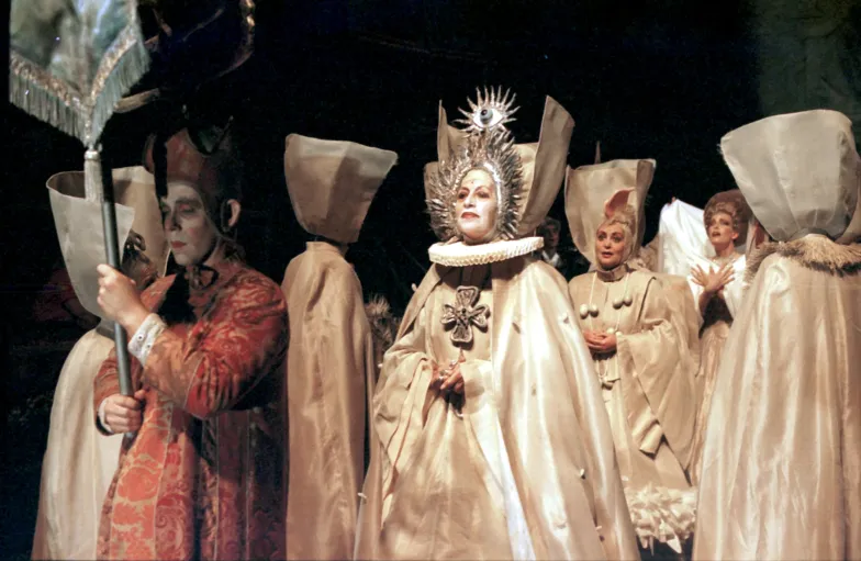 Pasen y vean, un acontecimiento de hace 29 años renueva su fecunda creatividad al exponer trajes y fotografías de escenas con el vigoroso mundo de su creador Francisco Nieva, al fin estrenado en Madrid -prohibida su obra desde 1962-.